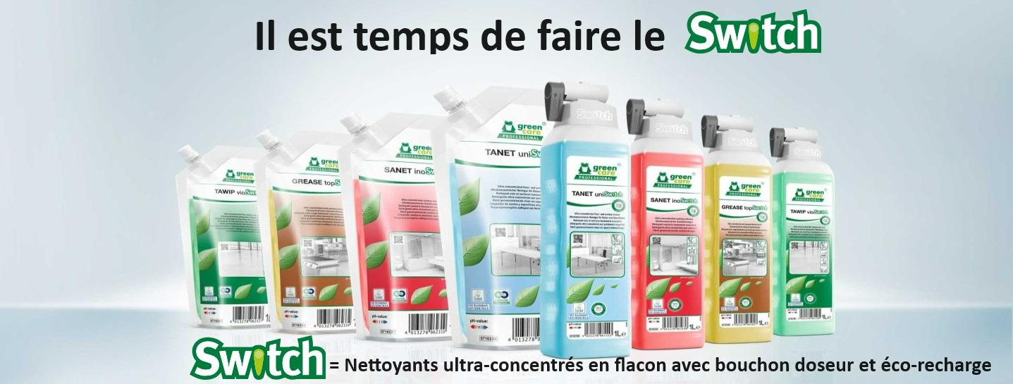 L’emballage de SANET inoSwitch se compose d’un flacon et d’un bouchon de dosage Switch véritablement durables, fabriqués à 100 % à partir de matériaux recyclés post-consommation, grâce auxquels un dosage précis et sûr est garanti sans contact direct avec le produit concentré.